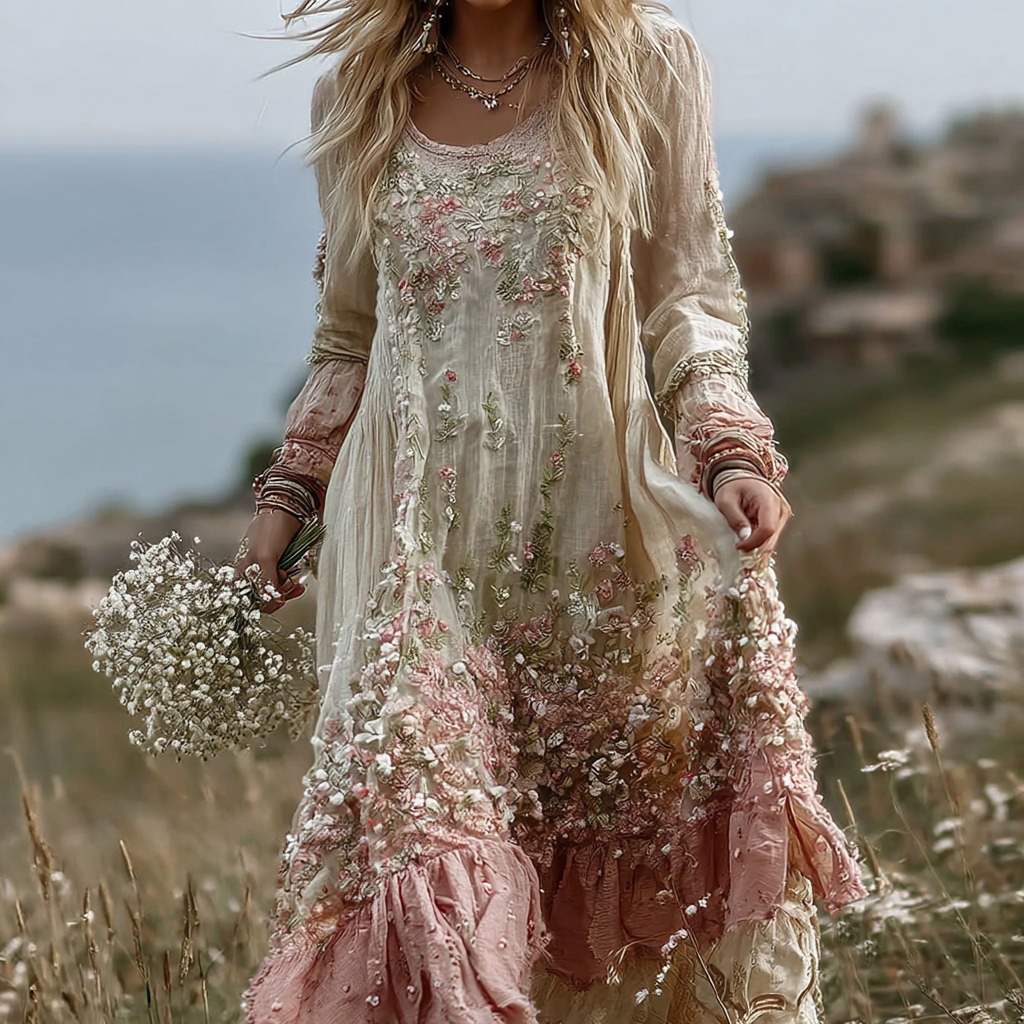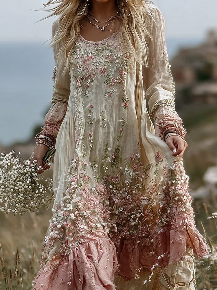 Women's Vintage Floral Embroidery Gradient Pattern Round Neck Dress$7.20 USD$70.00 USD
