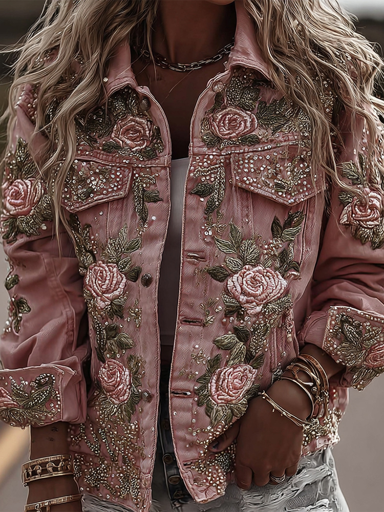 Women's Vintage Pink Rose Embroidery Art Round Neck Long Sleeve Linen Blend T-shirt$5.80 USD$56.00 USD