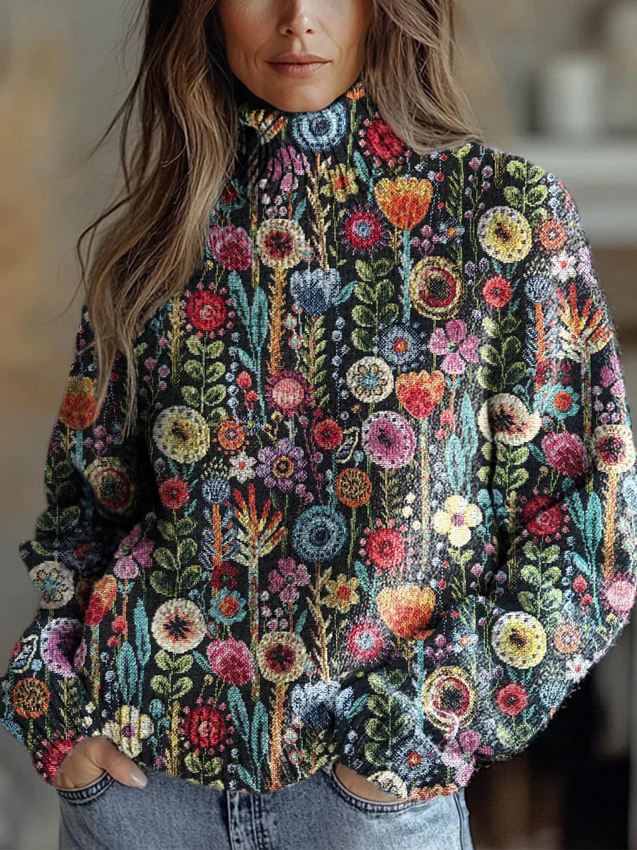 Women's Vintage Art Flower Print Knit Turtleneck Pullover Sweater$36.99 USD$65.00 USD