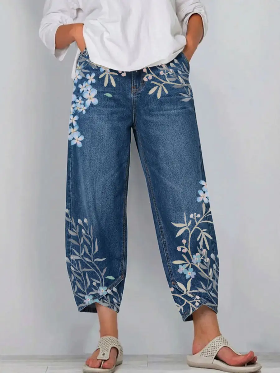 Women's Artistic Flowers Print Casual Cotton Denim Pants$4.99 USD$44.50 USD
