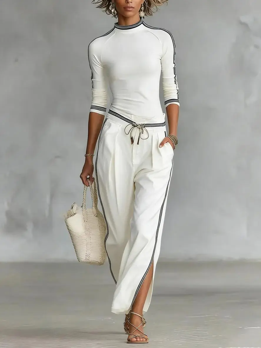 Cozy Stretch Knit Top And Linen And Cotton Trousers Two-piece Set$4.99 USD$46.99 USD