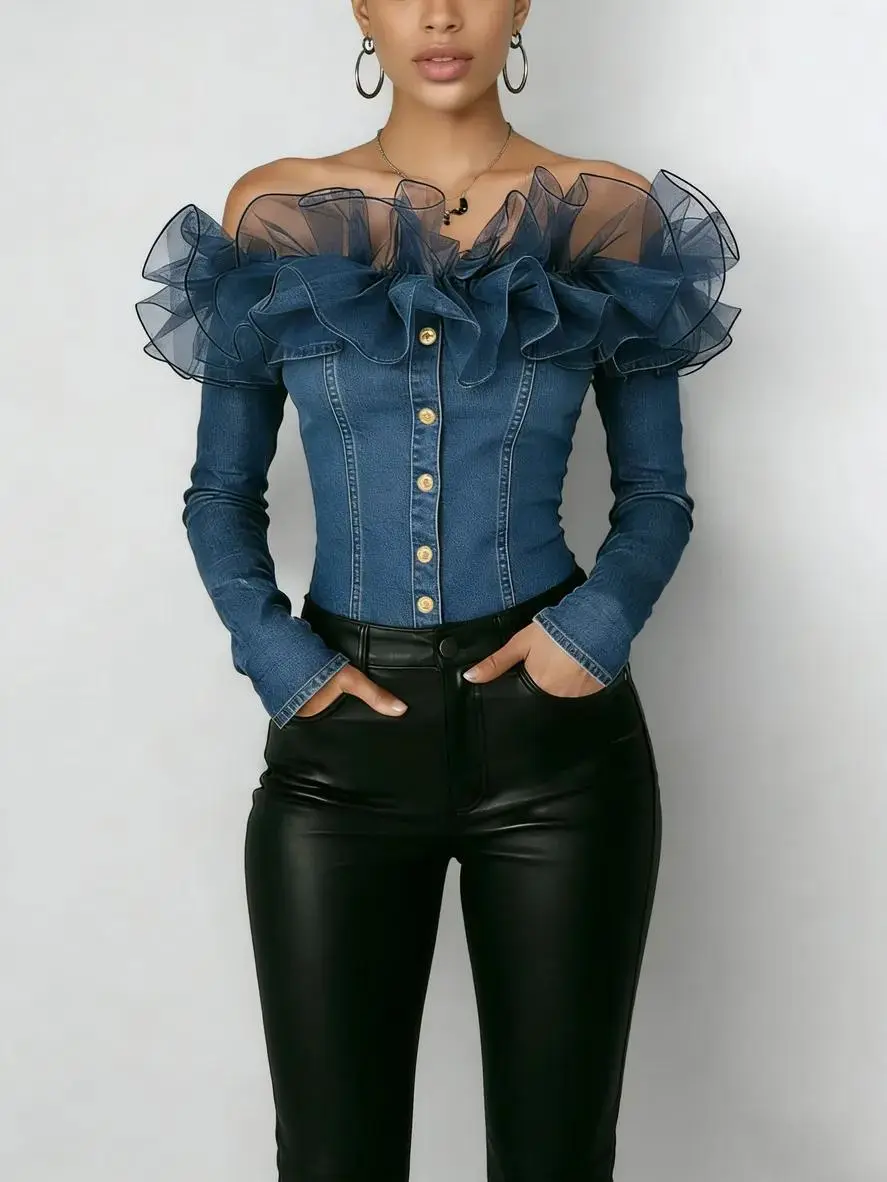 Fashionable Patchwork Organza Ruffled Denim Top$7.39 USD$48.88 USD