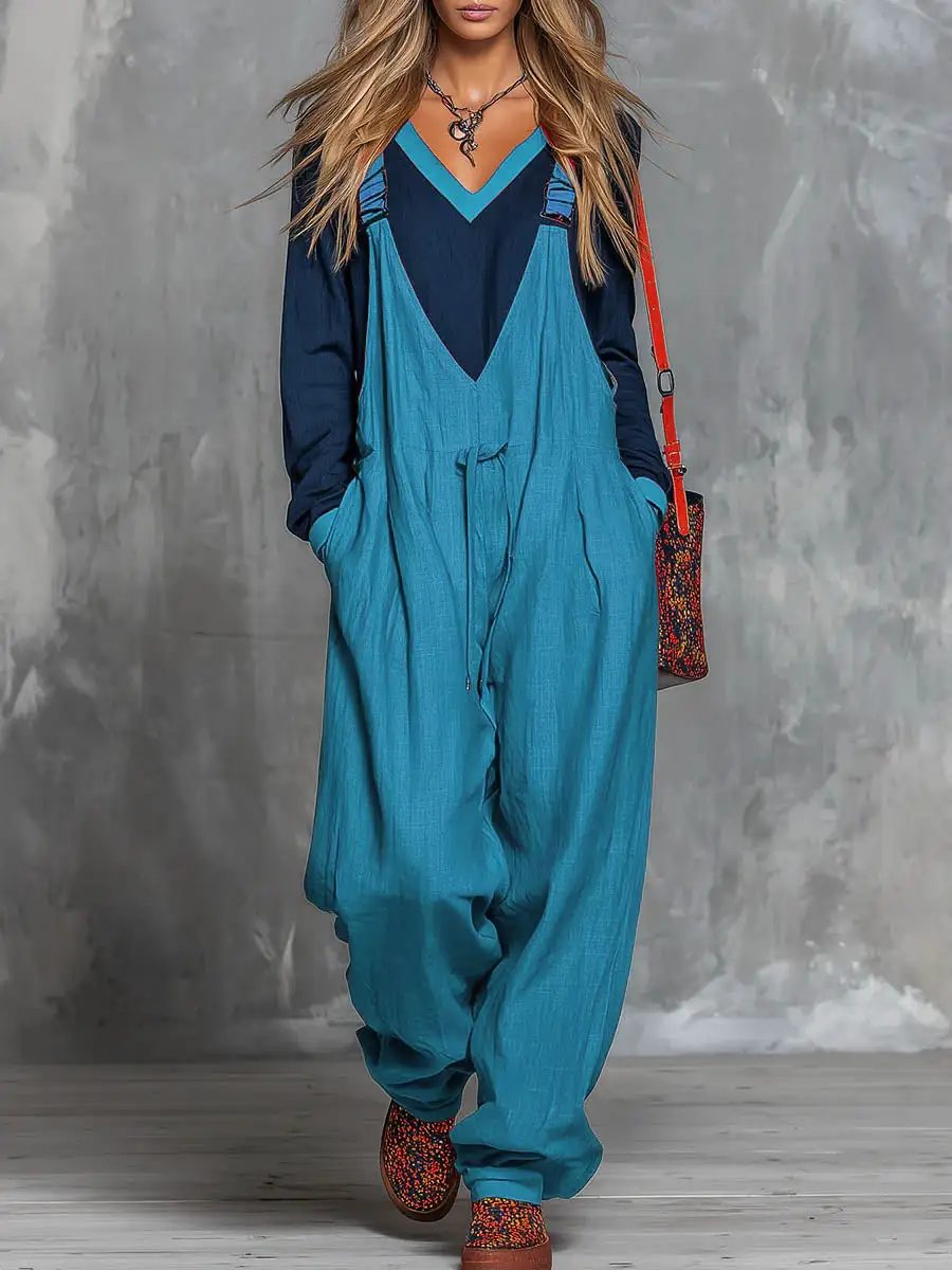Women's Color-block Patchwork Round Neck Long-sleeved Casual Loose Top And Cotton And Linen Suspender Wide-leg Jumpsuit Set.