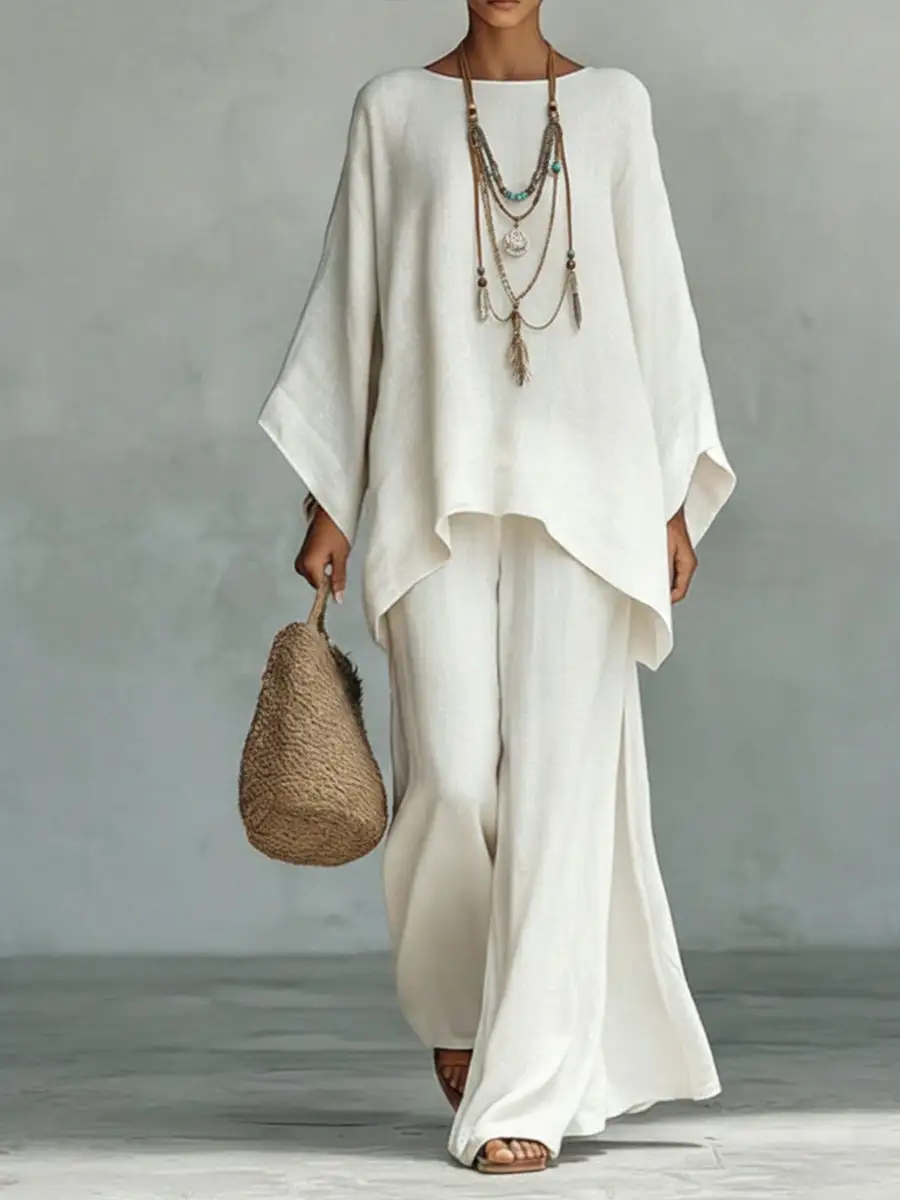 Women's Comfortable, Loose-fitting Linen And Cotton Top And Wide-leg Pants Two-piece Set.
