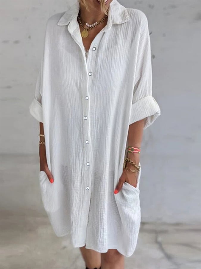 Women's Cotton Linen Solid Pocket Long Sleeve Lapel Button Down Shirt Dress