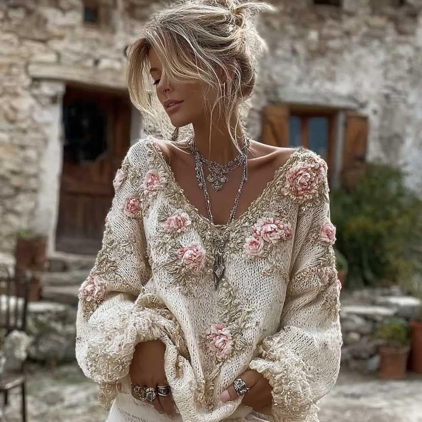Women's Vintage Pink Flowers Art V-neck Cozy Knit Sweater